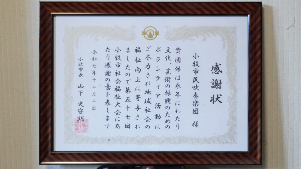 2025.12.11 感謝状をいただきました 12月2日、第57回小牧市社会福祉大会において、小牧市民吹奏楽団の長年に渡る活動に対し小牧市長より感謝状をいただきました。昭和53年12月の創立ですので、満47年の節目にたいへん有り難い記念となりました。創立50周年に向けて大きな励みとなりました。 < 前の記事へ お知らせ一覧へ戻る